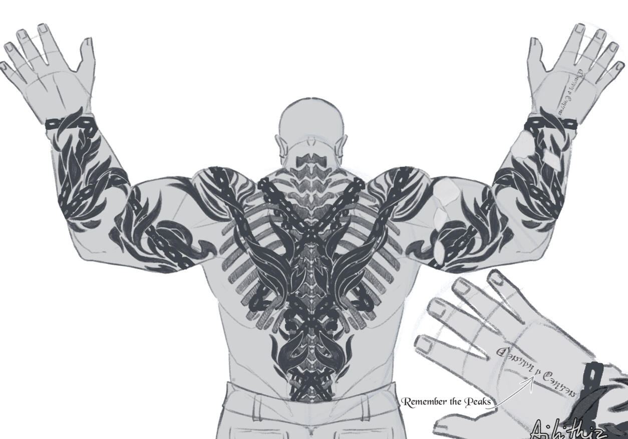 Though not as bulky, nor tall, as some of his Roegadyn brethren, he still cuts an imposing figure - accentuated by his tattooes, and his eerily hairless body.He has his share of scars, but the most prominent one is the one earned at the world's end - large teeth marks on his right arm.That said, he'd not to flaunt these features, preferring to wear long-sleeved shirts and jackets - except, perhaps, in the safety of his smithy.